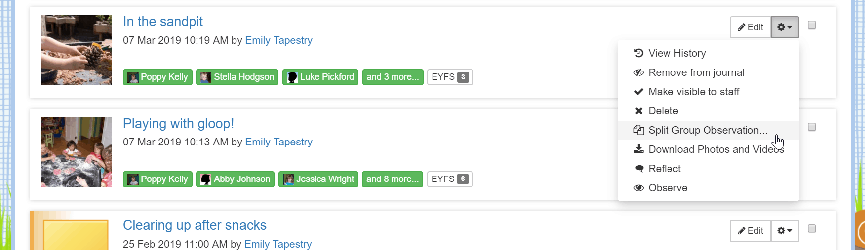 Even better, if you want to add anything unique to a certain child e.g. a picture or an assessment, you can ‘split’ those group observations so that each child gets their own copy – without you having to repeat anything!